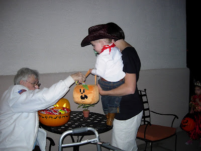 With cowboy hat that he actually left on for trick or treating. :)